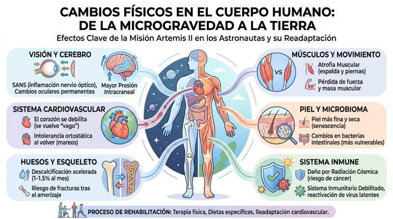 Estudios en misiones anteriores han demostrado que el corazón puede volverse un poco más esférico y perder masa muscular durante el vuelo espacial. Al regresar de Artemis II, el sistema cardiovascular de los astronautas tendrá que reentrenarse para soportar la presión arterial terrestre. Esto se traduce en una fatiga extrema y una frecuencia cardíaca elevada ante cualquier esfuerzo físico mínimo durante los primeros días en la Tierra.